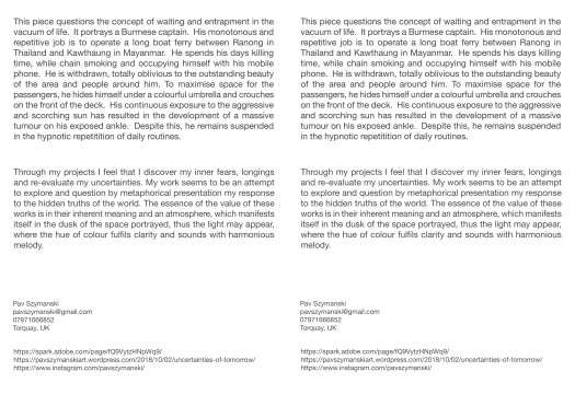 50 copies of my design will be printed back to back and doubled on A4 photo card. When cut in half, this will create 100 A5 postcard type of information. The idea is to explain and promote my work.