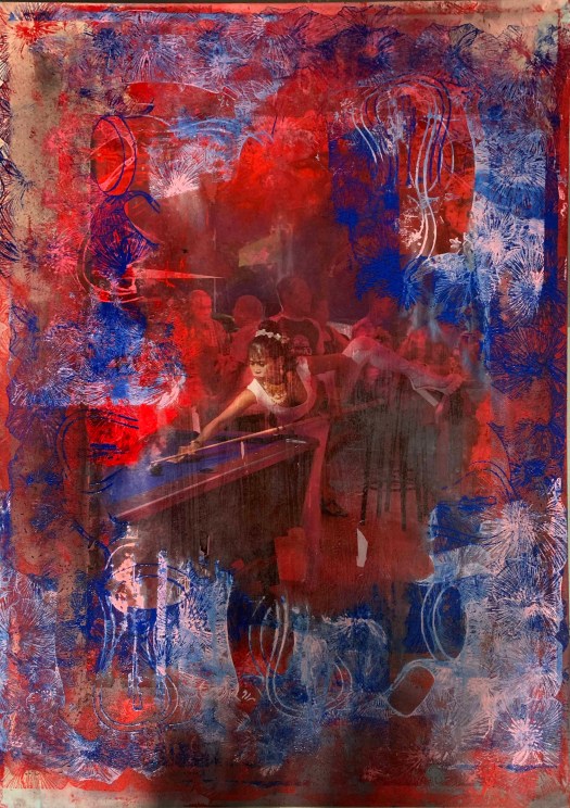 I have started to overprint the under image with deep and cerulean blue. The surface was than blasted with a jet of water to achieve a range of accidental effects and bleeding colour stains. I have tried to control this process with sponges and used brushes to direct the glaze to specific areas on the piece. Subsequently, the top layer is divided into smaller compositional areas and the pattern of poppies is somehow more difficult to decipher. The next step is to continue with the printing process, while extending the colour pallet and move towards using gold.