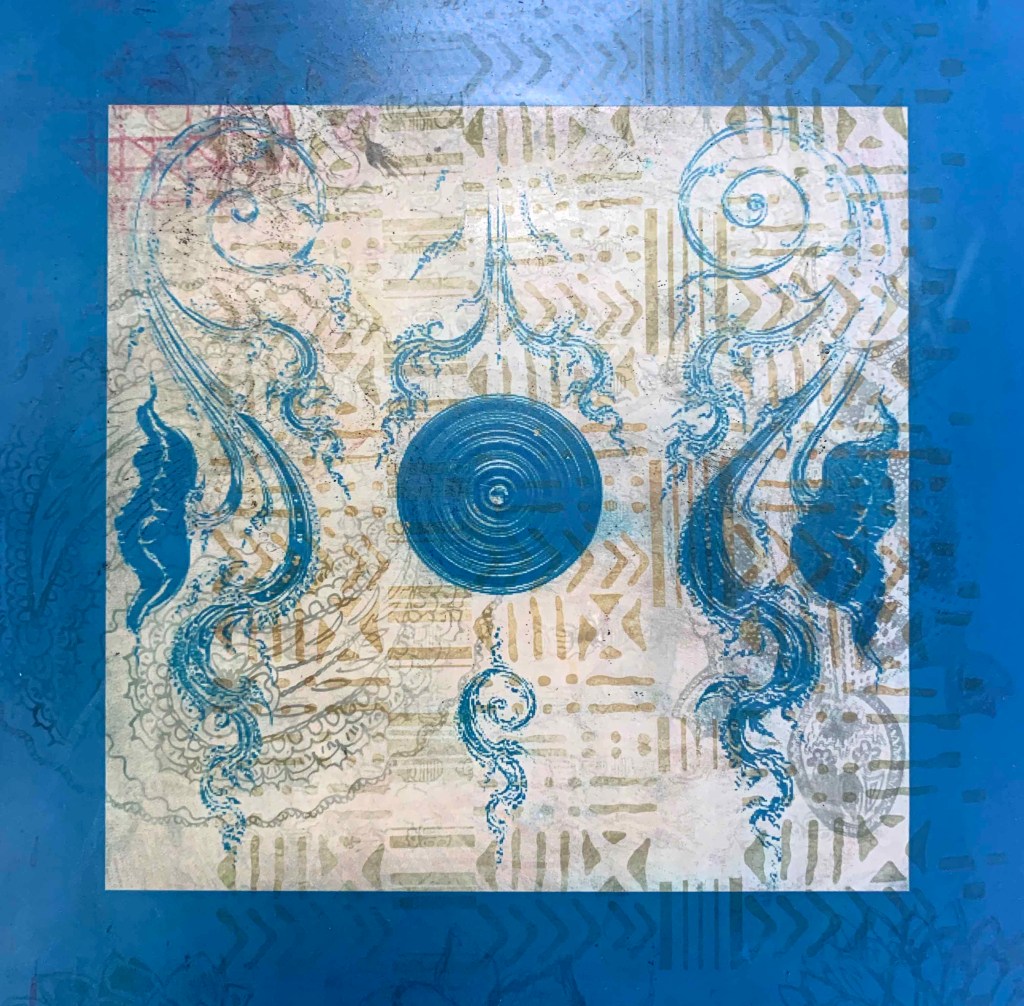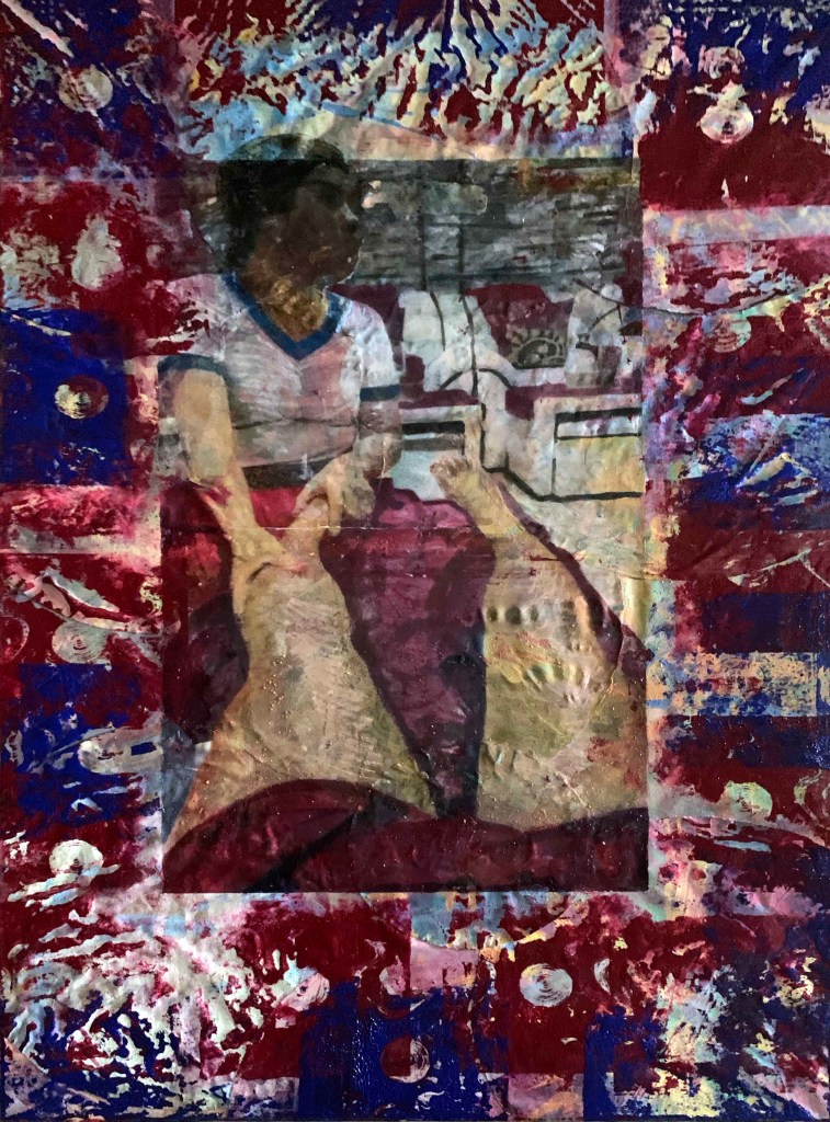 However, my creative intention was to use the screen in a much more spontaneous way. I overprinted the colourful frame around the masseur. I tried to echo the existing colour scheme in order to achieve a sense of cohesion, unity and flow. To destroy an effect of a decorative motif, I used a wet sponge to work into the prints and make them bleed.