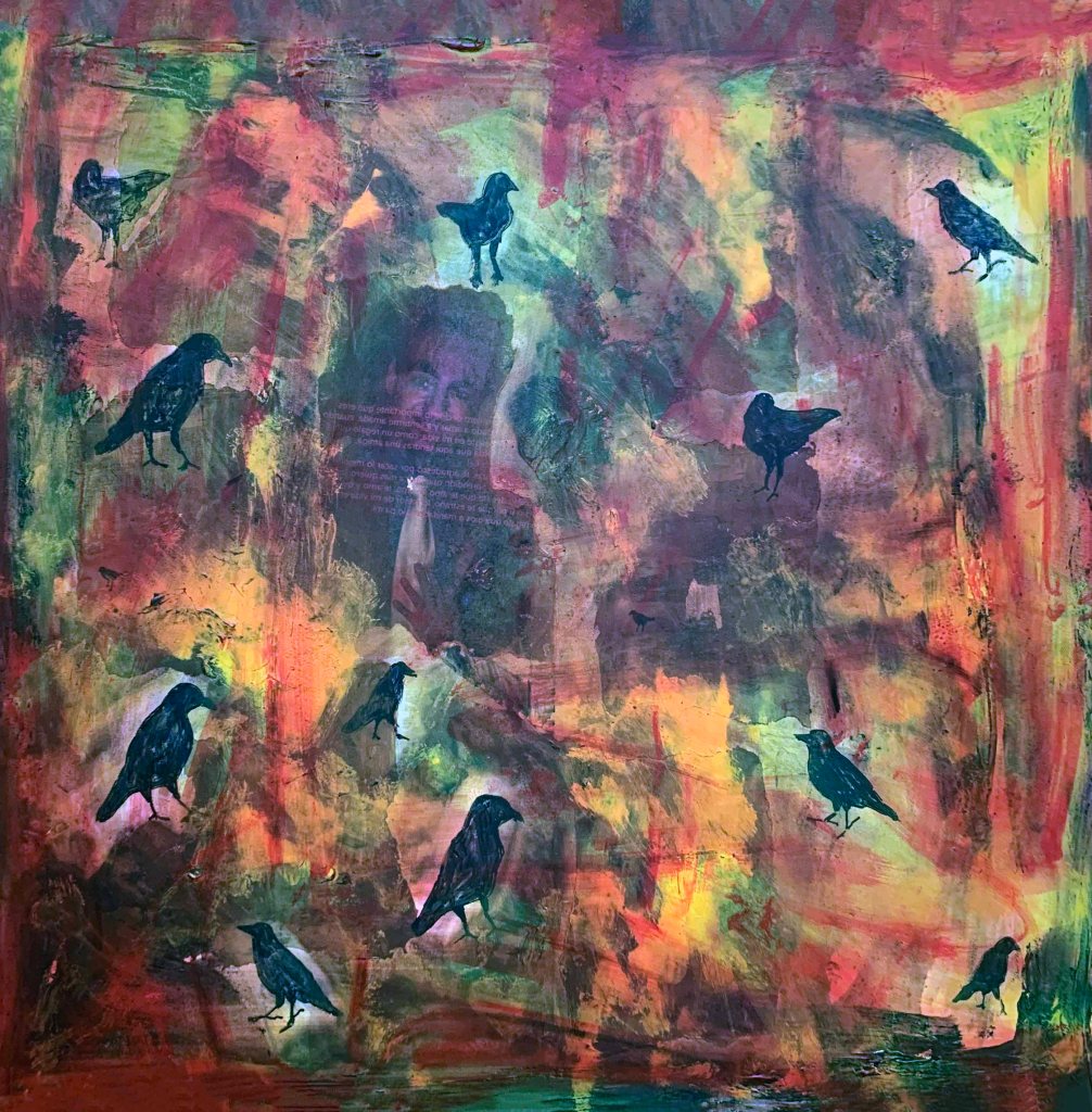 Subsequently, I started to experiment with a range of glazes using alkyd paints. I wanted to drift away from the time typically used media in my studio: oil and encaustic media. Alkyd paints are thicker and stronger. They consist of thermoplastic polyester resins made by heating polyhydric alcohols with polybasic acids or their anhydrides. Their main function is to create protective coatings, which are resistant to ageing and general wear. This physical property of this toxic medium creates a significant clash with my need to protect the significance of the past. To experiment with the viscosity and luminosity of the glazes, I have diluted them with the best quality of extra virgin olive oil. The use of a top-of-the-range product, here again, is intentional and carefully thought out. The idea was to depart from commercial qualities of cheap and raw linseed oil. I wanted to replace them with a natural and silky translucency of an opulent food ingredient. It is like feeding the birds and, simultaneously, covering the essence of the subject matter of the under image with a preserving layer of indulgence, luxury and melancholia. The additional purpose of this is try to safe myself from the attack of the cruel and metaphorically important ravens and crows.