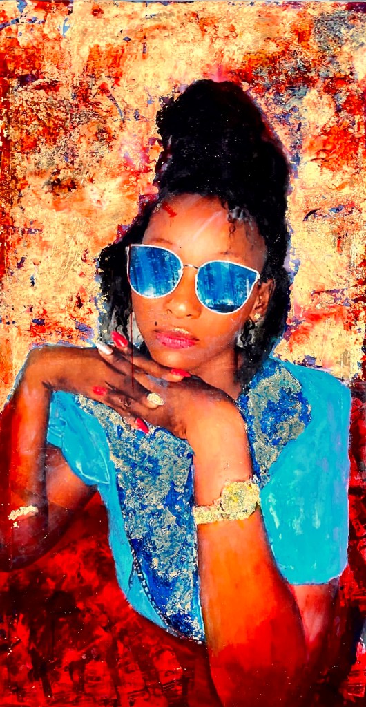 This painting is inspired by the story of young Theresa from Senegal. She works for a hotel and struggles to make ends meet with her minimal salary. To make more money, she is forced into a dark world of accompanying foreign men for a monetary incentive. The abuse she endures leaves physical marks on her body, but she remains strong and fights for every moment of her life.