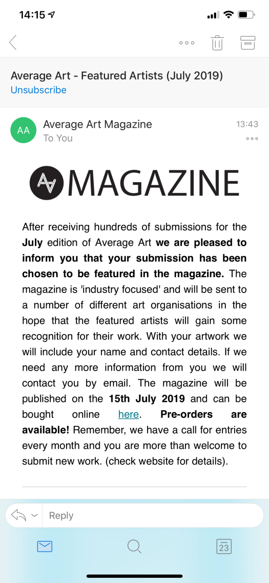 “After receiving hundreds of submissions for the June (July and August) edition of Average Art we are pleased to inform you that your submission has been chosen to be featured in the magazine. The magazine is ‘industry focused’ and will be sent to a number of different art organisations in the hope that the featured artists will gain some recognition for their work. With your artwork we will include your name and contact details. If we need any more information from you we will contact you by email. The magazine will be published on the 15th June and July 2019 and can be bought online here. Pre-orders are available! Remember, we have a call for entries every month and you are more than welcome to submit new work. (check website for details).”