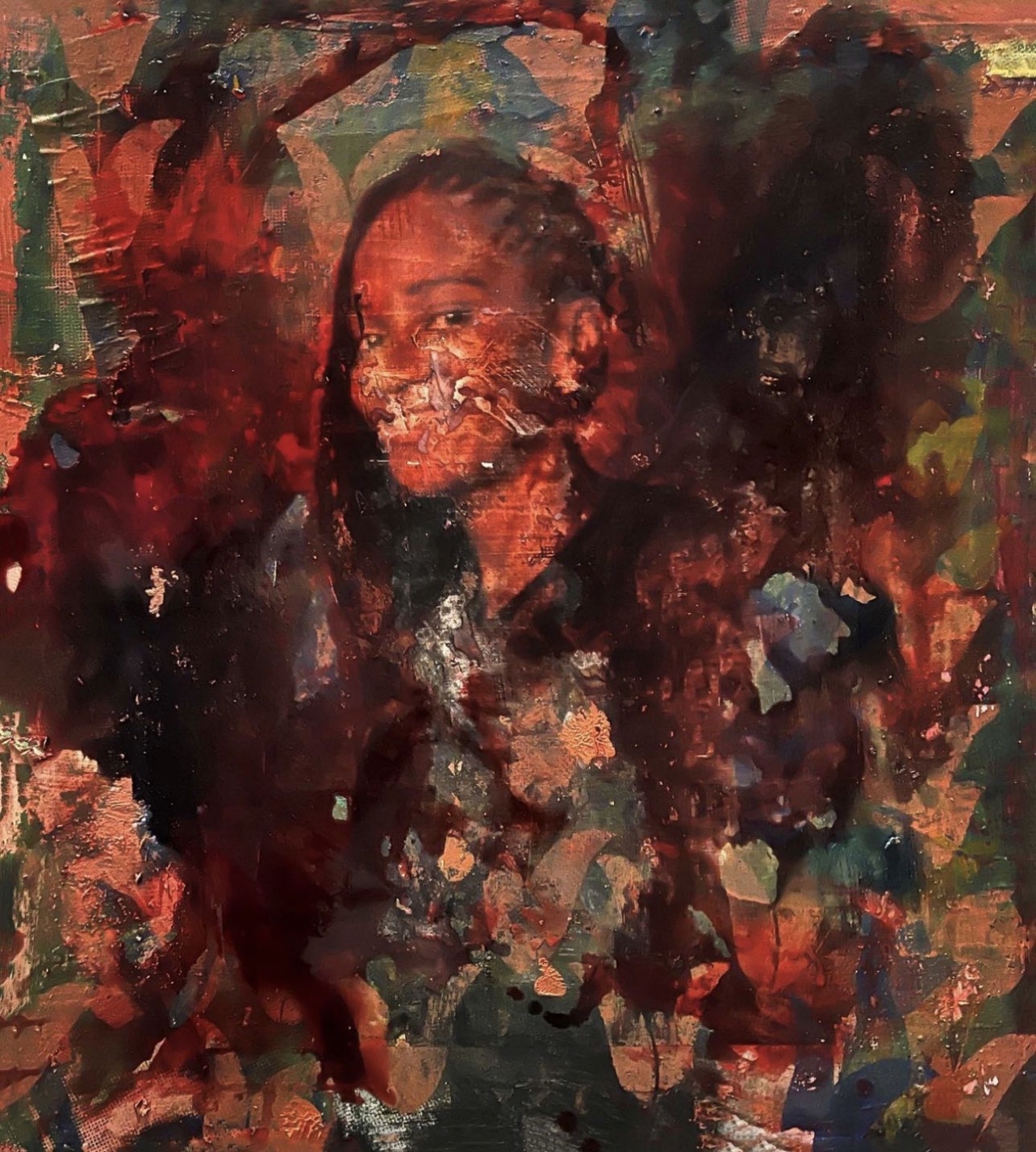 I have started to introduce a range of vibrant details in the background space. The idea was to create a sense of cohesion and belonging. I have used a repetitive motif of a baobab tree, which is typically associated with this fantastic island. The current stage of the painterly process is below: