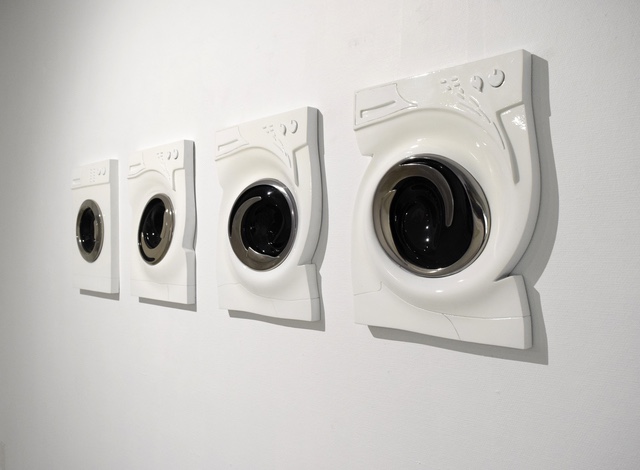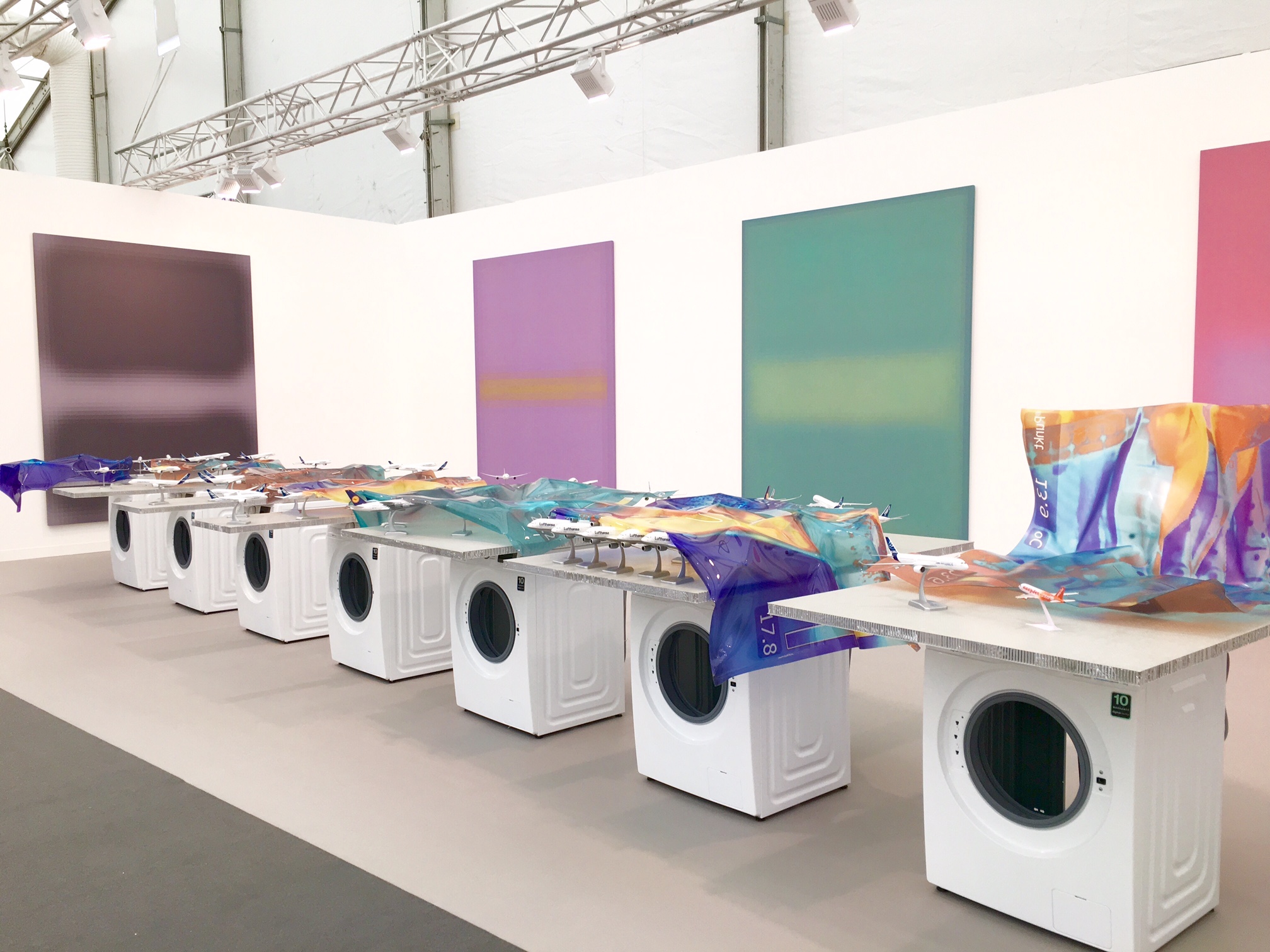 (Her) striking sculpture deconstructs and recombines industrial and domestic materials. The model airplanes, washing machines, thermal imaging and honeycomb cardboard sheets present a jarring landscape that both entices and repels viewers.