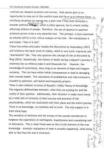 1. Art allows us to experience uncertainty and risk in a totally different capacity to the sciences and philosophy. It deals with an emotionally charged reflection rather than an empirical analysis of these phenomena. Therefore, art formulates new perspectives of embracing and understanding the world, which are far beyond the empirical and tactile experiences.