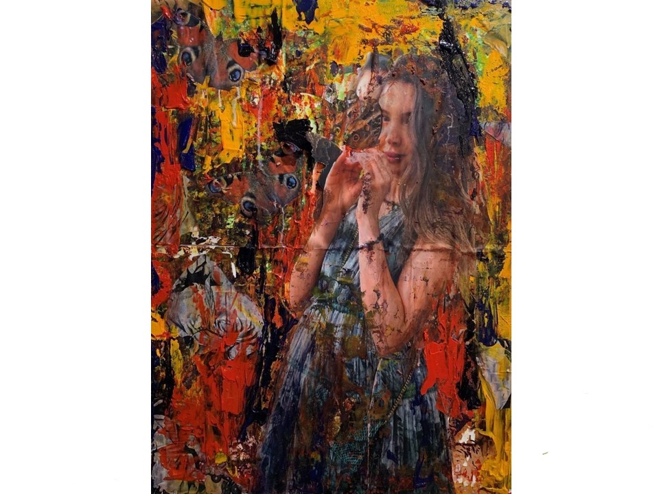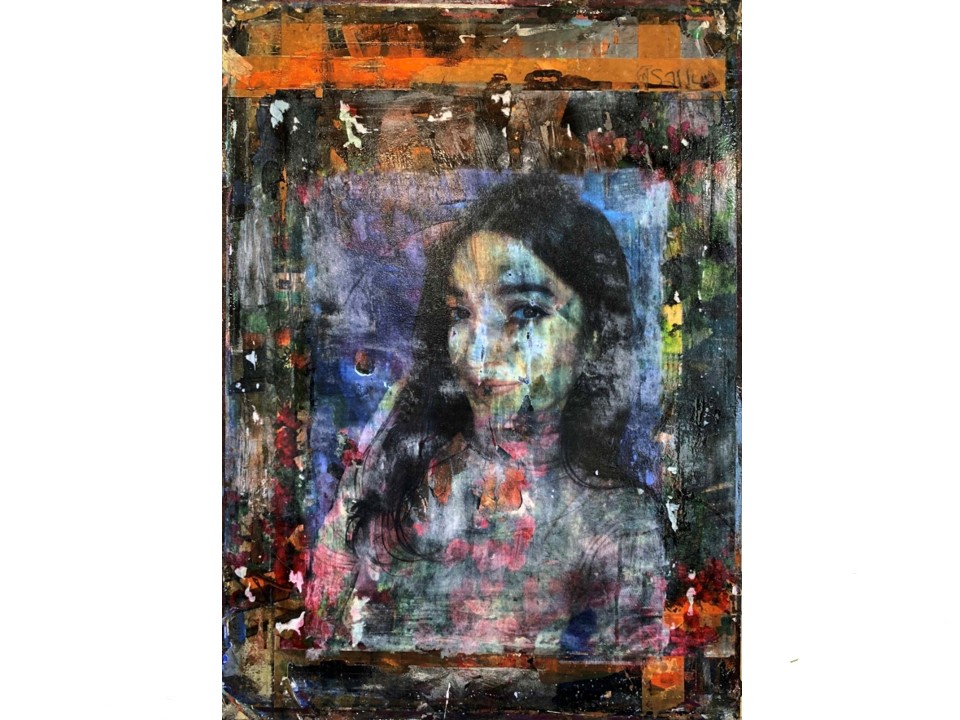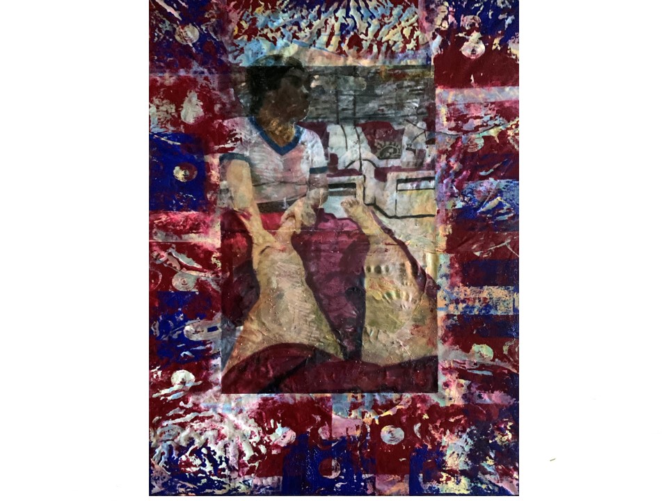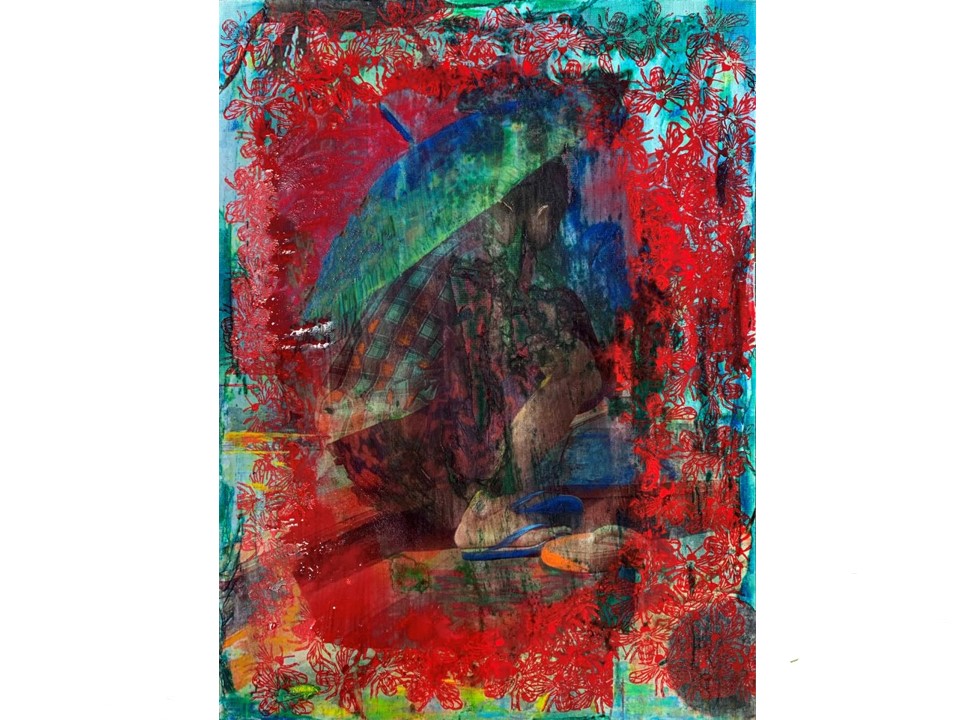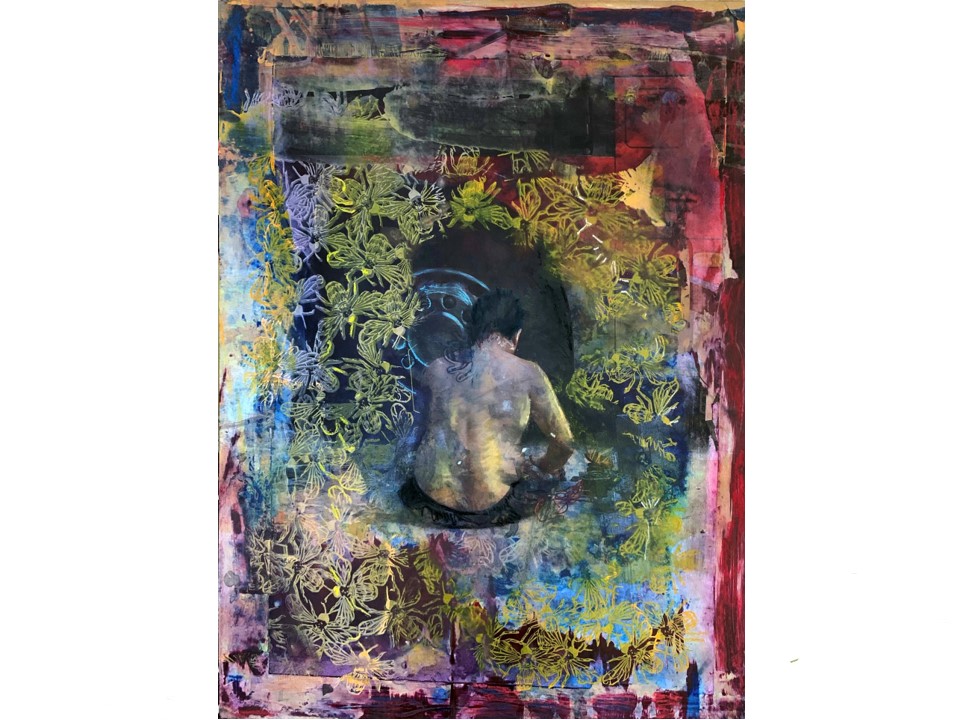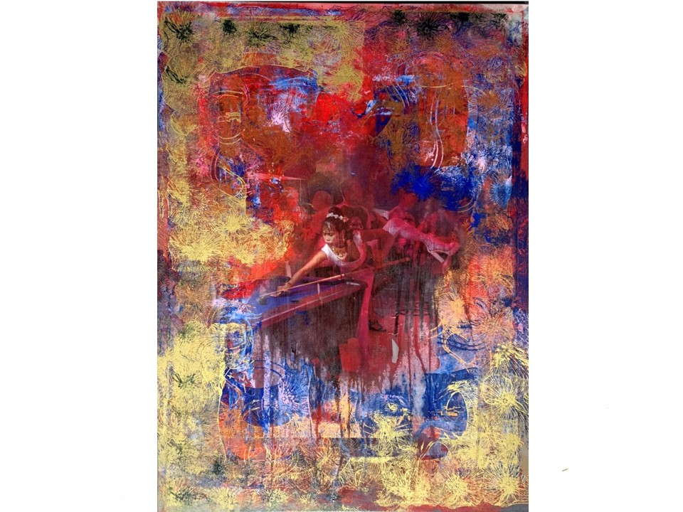 This is quite a new approach to image making for me. I started by creating a multi-coloured background layer. This under image was than continuously reworked and refined. I was using un-primed calico as a background material for this process.