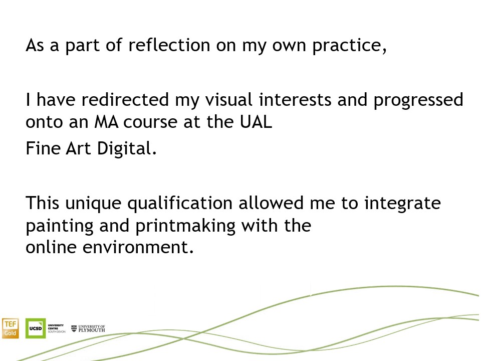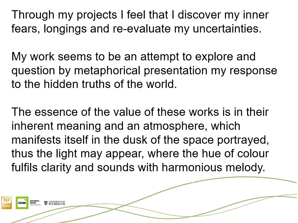 I was invited, for the third time, to deliver a presentation about my research project. When designing a structure for my talk, I divided the supporting PowerPoint into two distinctive sections. The first part was devoted to my recent achievements, exhibitions and awards. The second, focused on my last pieces. I have decided to cover the most current period of the last 18 months only.