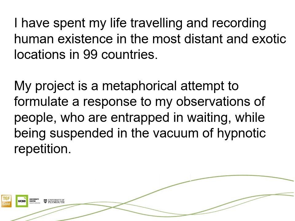 I have experimented with a range of possibilities and considered a number of unassuming angles for shooting. My creative intention was to ‘go’ beyond a simple use of a documentary or media approach. I wanted to create a short art film.
