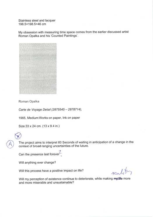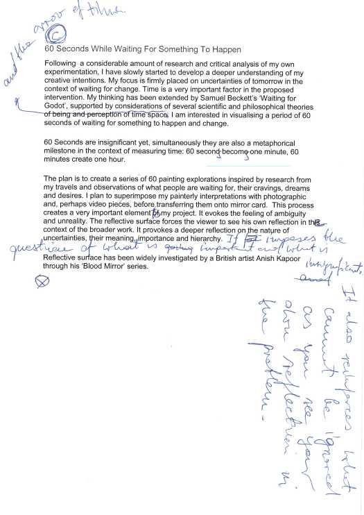 Following a considerable amount of research and critical analysis of my own experimentation, I have slowly started to develop a deeper understanding of my creative intentions. My focus is firmly placed on uncertainties of tomorrow in the context of waiting for change. Time is a very important factor in the proposed intervention. My thinking has been extended by Samuel Beckett’s ‘Waiting for Godot’, supported by considerations of several scientific and philosophical theories of being and perception of time space. I am interested in visualising a period of 60 seconds of waiting for something to happen and change.