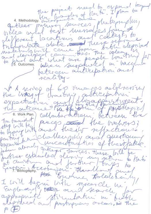 The project needs to grow and cover areas beyond the borders of Haiti. I plan to gather primary sources and record them through painting, photography, experimental video and text message manipulations from different locations to triangulate data and time through questioning their predicament during my return visit to Haiti.